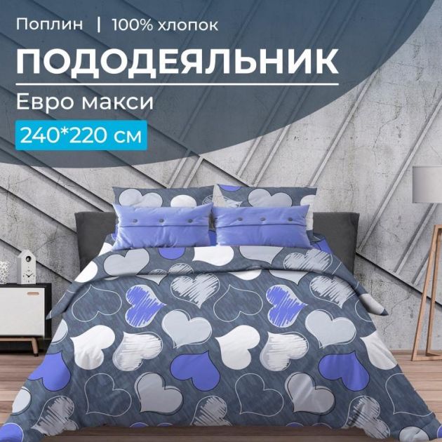 Пододеяльник Евромакси 240*220 см, поплин (Романтика, синий)