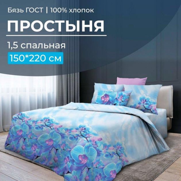 Простыня 1,5-спальная, бязь ГОСТ (Орхидеи, бирюзовый)