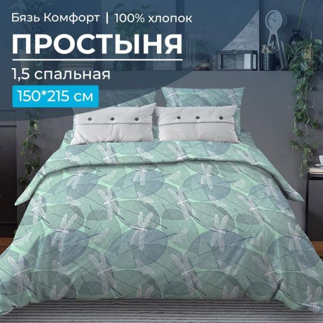 Простыня 1,5-спальная, бязь "Комфорт" (Стрекозы, мятный)