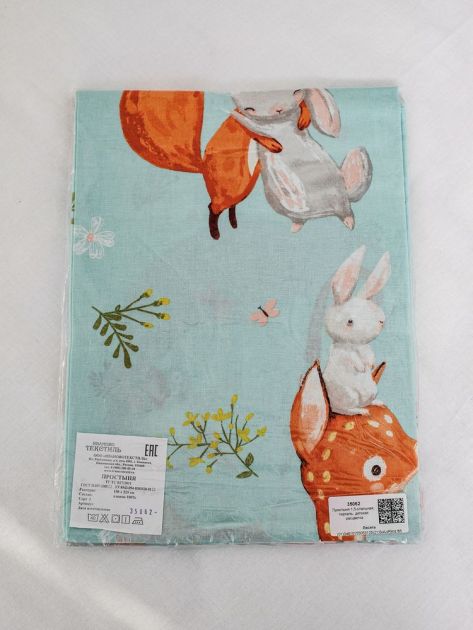 Простыня 1,5-спальная с детским рисунком. Ткань - перкаль, плотность 102 г/м2, состав ткани - 100 % хлопок. Группа товара