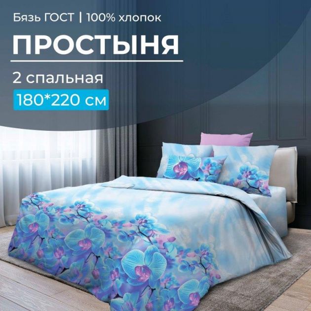 Простыня 2-спальная, бязь ГОСТ (Орхидеи, бирюзовый)