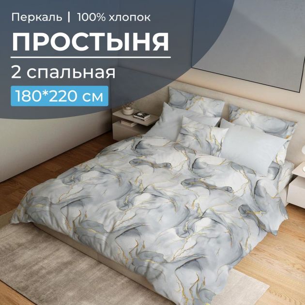 Простыня 2-спальная, перкаль (Мраморный узор, серый)