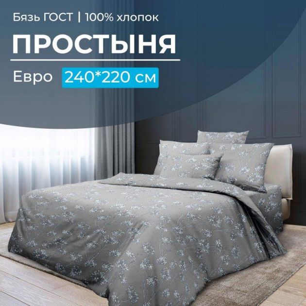 Простыня Евроразмера 240*220 см из плотной набивной бязи качества ГОСТ (плотность 140г/м2). Группа товара