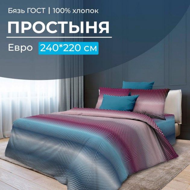 Простыня Евроразмера 240*220 см из плотной набивной бязи качества ГОСТ (плотность 140г/м2). Группа товара