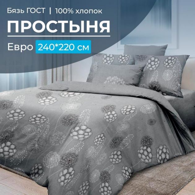 Простыня Евро 240*220 см, бязь ГОСТ (Данте, серый)