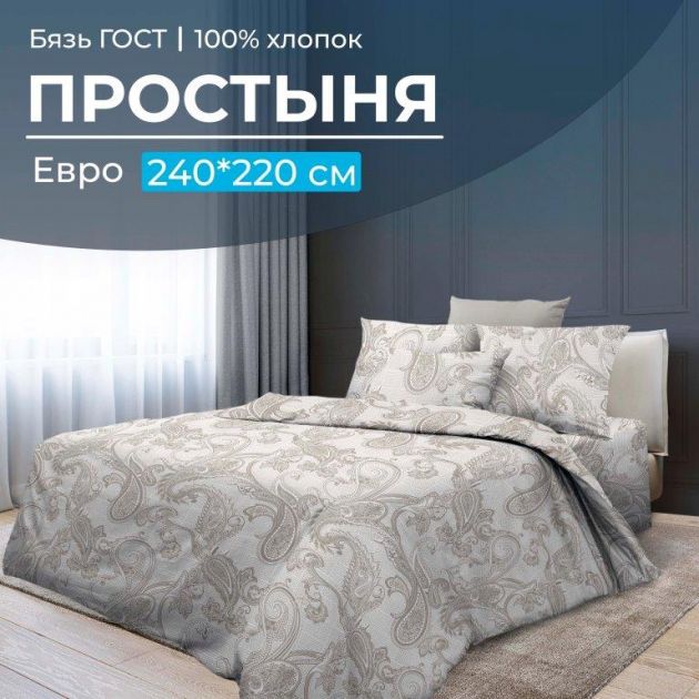 Простыня Евроразмера 240*220 см из плотной набивной бязи качества ГОСТ (плотность 140г/м2). Группа товара