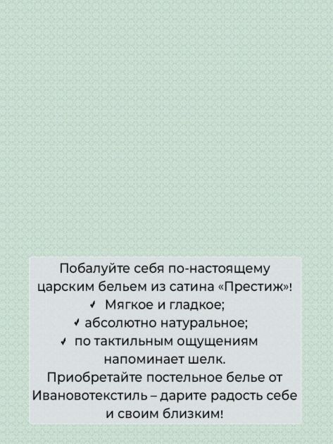 Бесшовная Евро простыня из сатина «Престиж» размером 240*220 см, плотностью ткани 115 г/м2. Постельное белье из сатина «Престиж» нежное, мягкое, из 100% хлопка, похожее на шёлк, но при этом прочное, износостойкое, выдерживает многочисленные стирки, не теряя исходного цвета. В нашем каталоге вы сможете собрать замечательный комплект постельного белья, исходя из Ваших предпочтений и размеров спальных принадлежностей, а благодаря великолепному качеству ткани и пошива постельное белье прослужит долго и будет радовать Вас и ваших близких. Группа товара