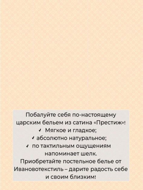 Бесшовная Евро простыня из сатина «Престиж» размером 240*220 см, плотностью ткани 115 г/м2. Постельное белье из сатина «Престиж» нежное, мягкое, из 100% хлопка, похожее на шёлк, но при этом прочное, износостойкое, выдерживает многочисленные стирки, не теряя исходного цвета. В нашем каталоге вы сможете собрать замечательный комплект постельного белья, исходя из Ваших предпочтений и размеров спальных принадлежностей, а благодаря великолепному качеству ткани и пошива постельное белье прослужит долго и будет радовать Вас и ваших близких. Группа товара
