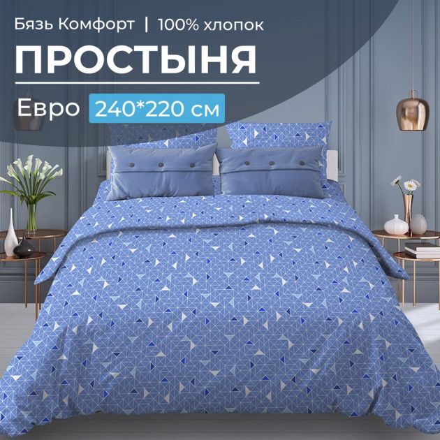 Простыня Евро, бязь "Комфорт" (Треугольники, светло-синий)