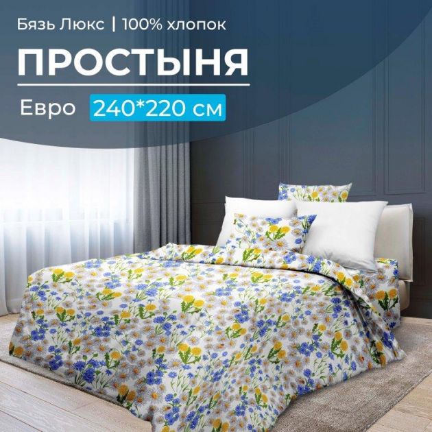 Простыня Евро из бязи «Люкс» размером 240*220 см, плотностью ткани 121 г/м2. Бязь «Люкс» - ткань из 100% натурального хлопка. По сравнению с обычной, бязь "Люкс" обладает более нежной и тонкой текстурой, но одновременно с этим прочная и плотная. Постельное белье из такой бязи не электризуется, мало сминается и легко отстирывается, пропускает воздух и влагу, высокоустойчивое к износу и абсолютно безопасно для здоровья. Рисунки на ткани из бязи "Люкс" яркие, выдерживают многочисленное использование. В нашем каталоге вы сможете собрать замечательный комплект постельного белья, исходя из Ваших предпочтений и размеров спальных принадлежностей. Вся наша продукция сертифицирована и соответствует ГОСТам. Мы являемся производителями, сами следим за выпускаемой продукцией и гарантируем высокое качество! Группа товара
