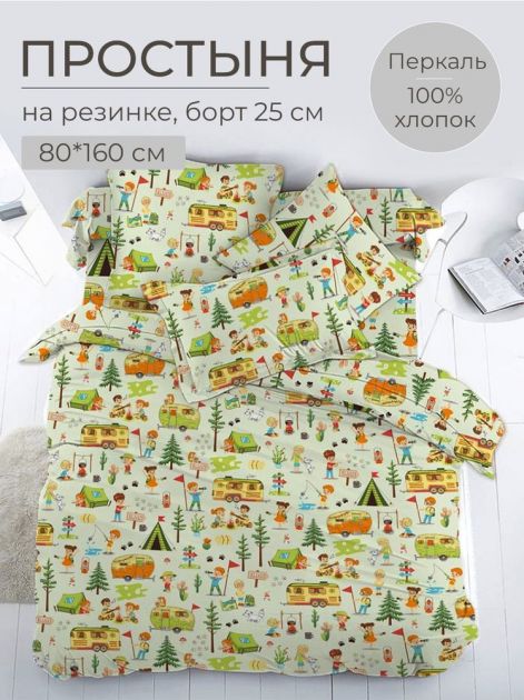 Простыня на резинке 080*160 см, перкаль, детская расцветка (Кэмпинг)
