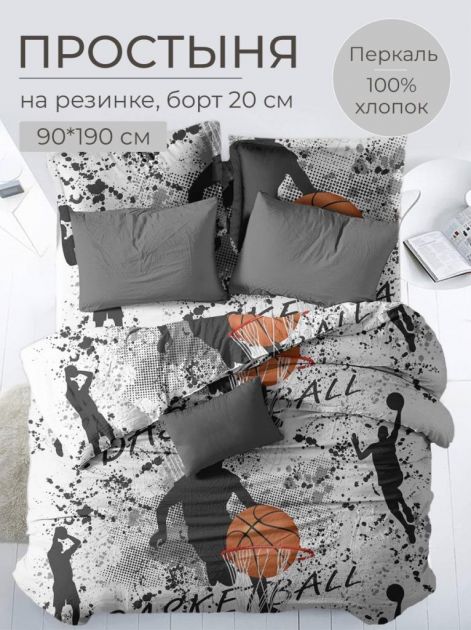 Простыня на резинке 090*190 см, перкаль, детская расцветка (Баскетбол)