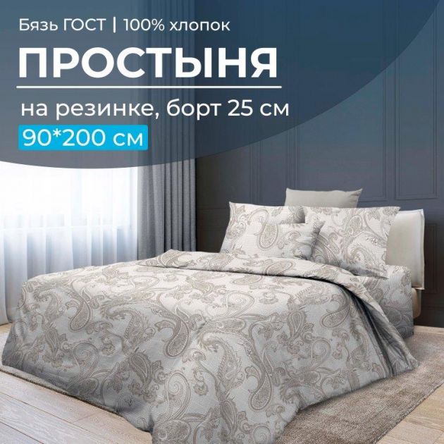 Простыня на резинке из бязи ГОСТ плотностью не менее 140 г/м2 на спальное место 90*200 см (ширина и длина матраса), борт глубиной 25 см. Резинка проходит по всему периметру спального места.