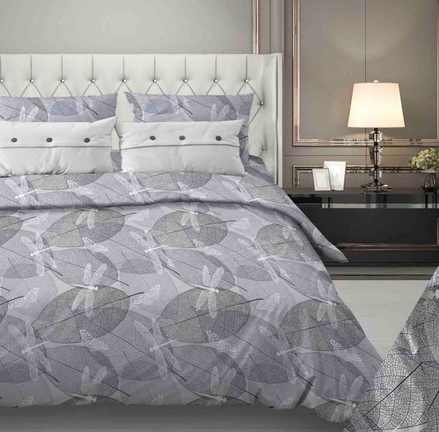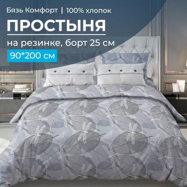 Простыня на резинке 090*200 см, бязь "Комфорт 150 см", борт 25 см (Стрекозы, серо-бежевый)