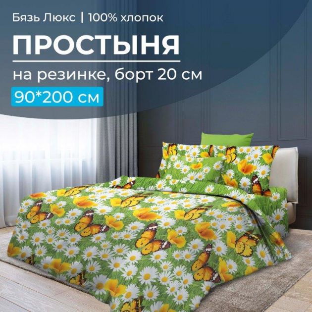 Простыня на резинке 090*200 см, бязь "Люкс", борт 20 см (Ромашковая поляна)