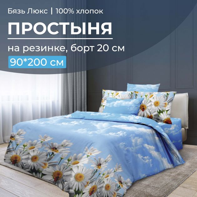 Простыня на резинке 090*200 см, бязь "Люкс", борт 20 см (Воздушные ромашки)