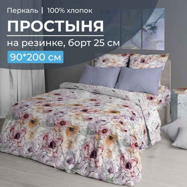 Простыня на резинке 090*200 см, перкаль, борт 25 см (Глория)