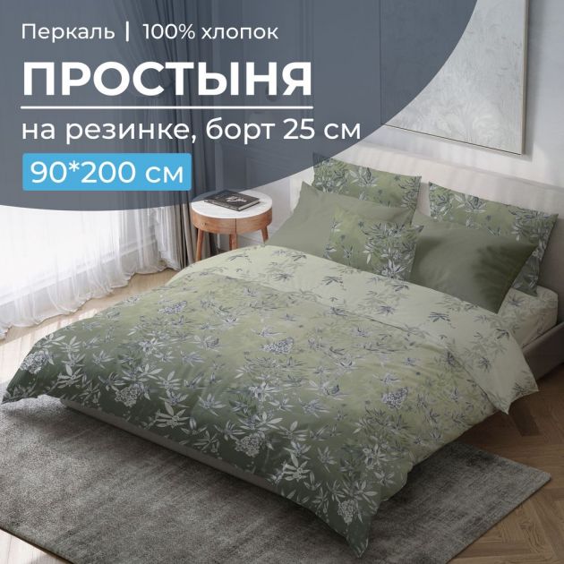 Простыня на резинке 090*200 см, перкаль, борт 25 см (Кассиопея, зеленый)