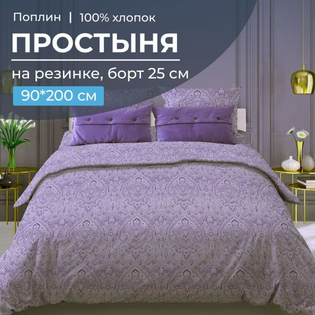 Простыня на резинке 090*200 см, поплин, борт 25 см (Дамаск, фиолетовый)