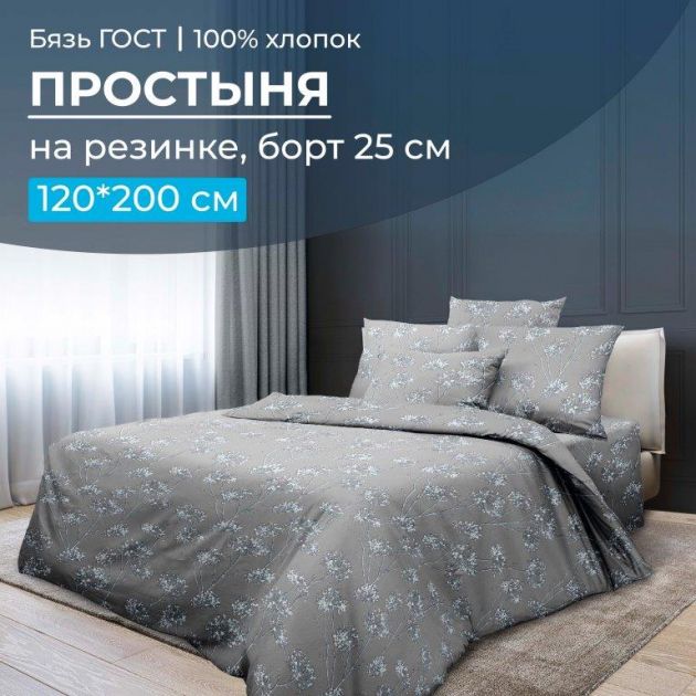 Простыня на резинке из бязи ГОСТ отличного качества. Плотность ткани не менее 140 г/м2. Размер спального места - 120*200 см (ширина и длина матраса), борт/спуск глубиной 25 см. Резинка проходит по всему периметру спального места.