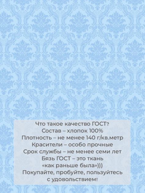 Очень удобная простыня на резинке из бязи ГОСТ плотностью ткани 140 г/м2 на спальное место 120*200 см (ширина и длина матраса). Простыня имеет глубокий борт/спуск 25 см. Резинка проходит по всему периметру (кругу) спального места. Простыни из бязи ГОСТ имеют длительный срок службы, ткань не линяет, не закатывается. у нее абсолютно натуральный состав - хлопок 100 %, она очень комфортна, не деформируется, хорошо впитывает влагу, позволяет коже дышать и способствует вашему полноценному отдыху! Обратите внимание! Простыни сшиты с учетом усадки ткани (с большим припуском по длине и ширине), поэтому необходима предварительная стирка данного швейного изделия. Мы являемся производителями, сами следим за выпускаемой продукцией и гарантируем высокое качество! Наши изделия произведены в Ивановской области, имеют сертификацию качества "ГОСТ 31307-2005", а также зарегистрированы в государственной системе маркировки "Честный знак". Группа товара