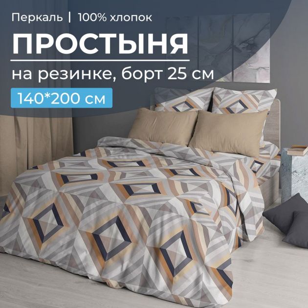 Простыня на резинке 140*200 см, перкаль, борт 25 см (Графис, бежевый)