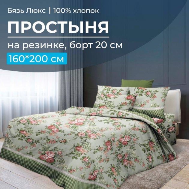 Простыня на резинке из бязи "Люкс" на мартас 160*200 см (ширина и длина матраса), борт глубиной 20 см. Резинка проходит по бокам спального места.