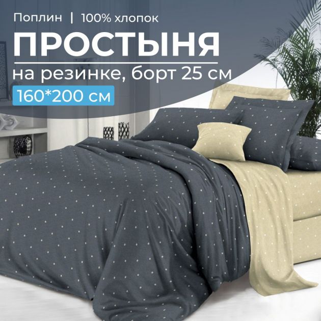 Очень удобная 2-спальная простыня на резинке из поплина плотностью ткани 110 г/м2 на спальное место 160*200 см (ширина и длина матраса). Простыня имеет глубокий борт/спуск 25 см. Резинка проходит по всему периметру (кругу) спального места. Простыня из поплина изготовлена из 100% хлопка, который обладает высоким качеством, что гарантирует Вам долговечность и удобство использования. Хлопковая простыня обеспечит приятную прохладу летом и тепло зимой, благодаря своей дышащей и гипоаллергенной структуре. Кроме того, она легко стирается и сохраняет свою форму и качество даже после многих стирок. Выберите качество и комфорт для своего сна с нашей хлопковой простыней на резинке из поплина!Обратите внимание! Простыни сшиты с учетом усадки ткани (с большим припуском по длине и ширине), поэтому необходима предварительная стирка данного швейного изделия. Группа товара
