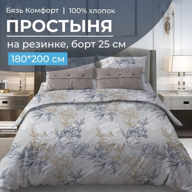 Простыня на резинке 180*200 см, бязь "Комфорт", борт 25 см (Симфония, серо-бежевый)