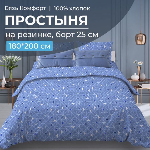Простыня на резинке 180*200 см, бязь "Комфорт", борт 25 см (Треугольники, светло-синий)