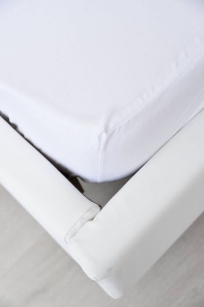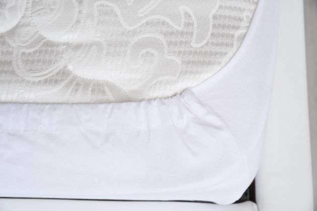 Простыня на резинке из отбеленной бязи ГОСТ плотностью 142 г/м2 на спальное место 200*200 см. Состав ткани - хлопок 100 %.